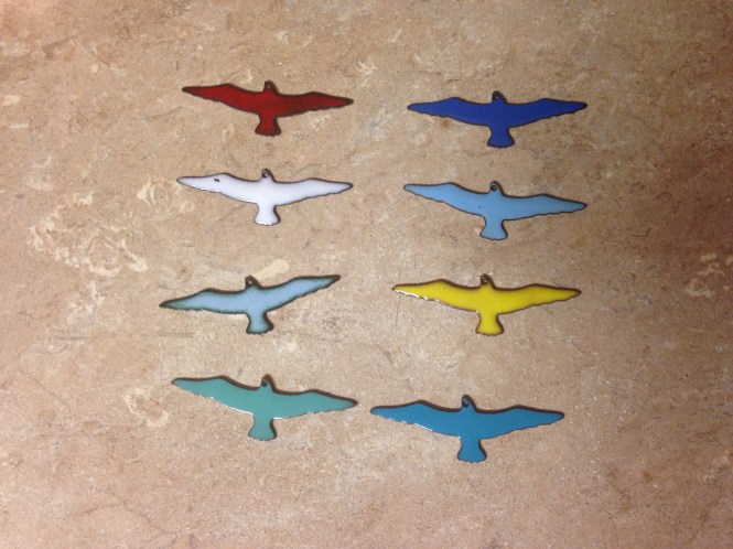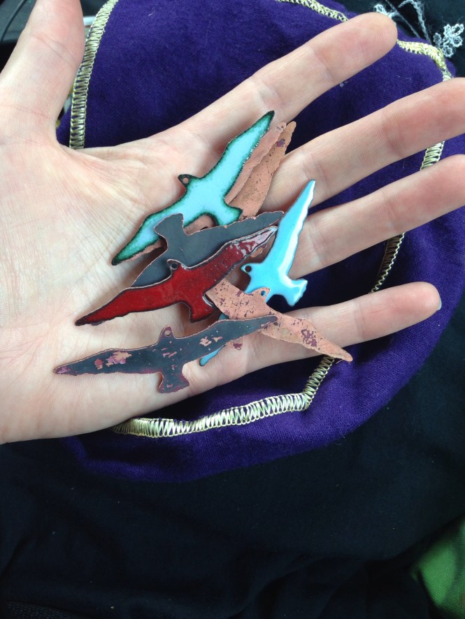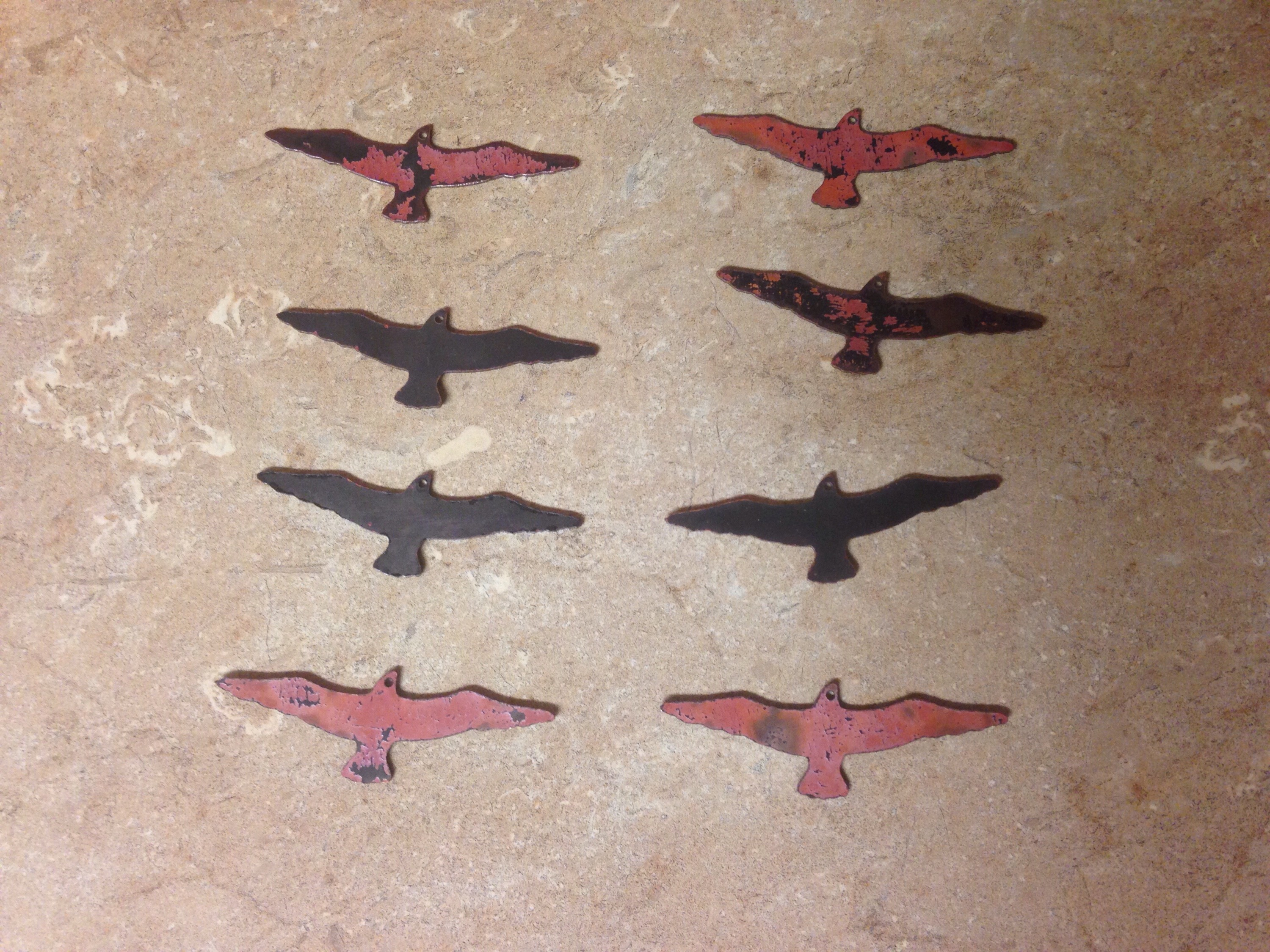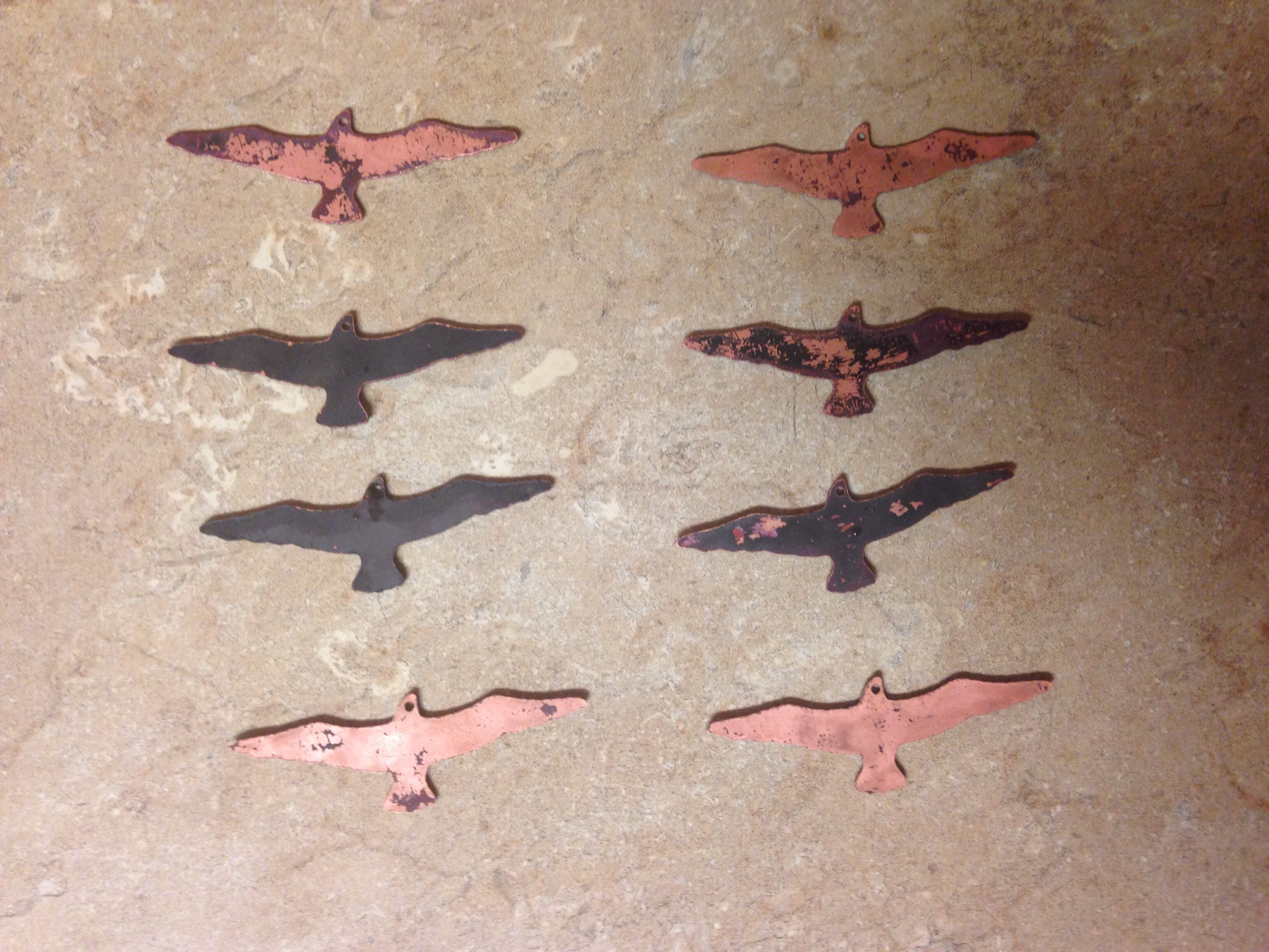I tried a pickeling solution today. I wanted to try the most none toxic and least expensive, so I tried a solution of vinegar and salt. Apparently the acidity of the solution will eat off the oxidization and fire scaling off of the copper. I used 1 tablespoon of salt per cup of vinegar. I let the vinegar heat up, added the salt, stirred till the salt dissolved, and then added the birds. I left them in for about a minute and a half and then took them out and scrubbed them with a tooth brush. They came out slightly better, but not drastically. There is still a lot of oxidation and fire scaling left on them. I plan to try the solution again and leave them in longer. I didn’t have enough time to try today.