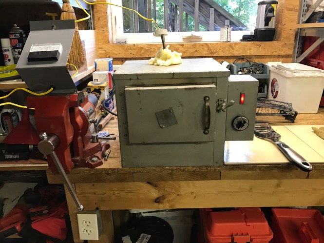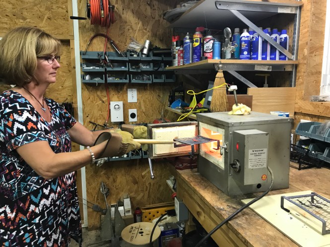 Once the kiln reaches 1,500 degrees Fahrenheit, we carefully place the tray of birds inside.