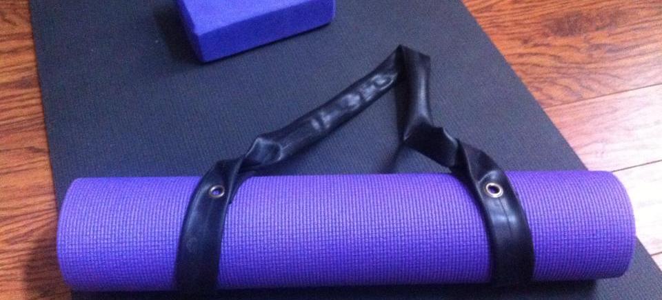 We collect old bicycle tire tubes from the local bike shop, clean the tubes up a bit, and turn them into useful things like yoga mat straps!